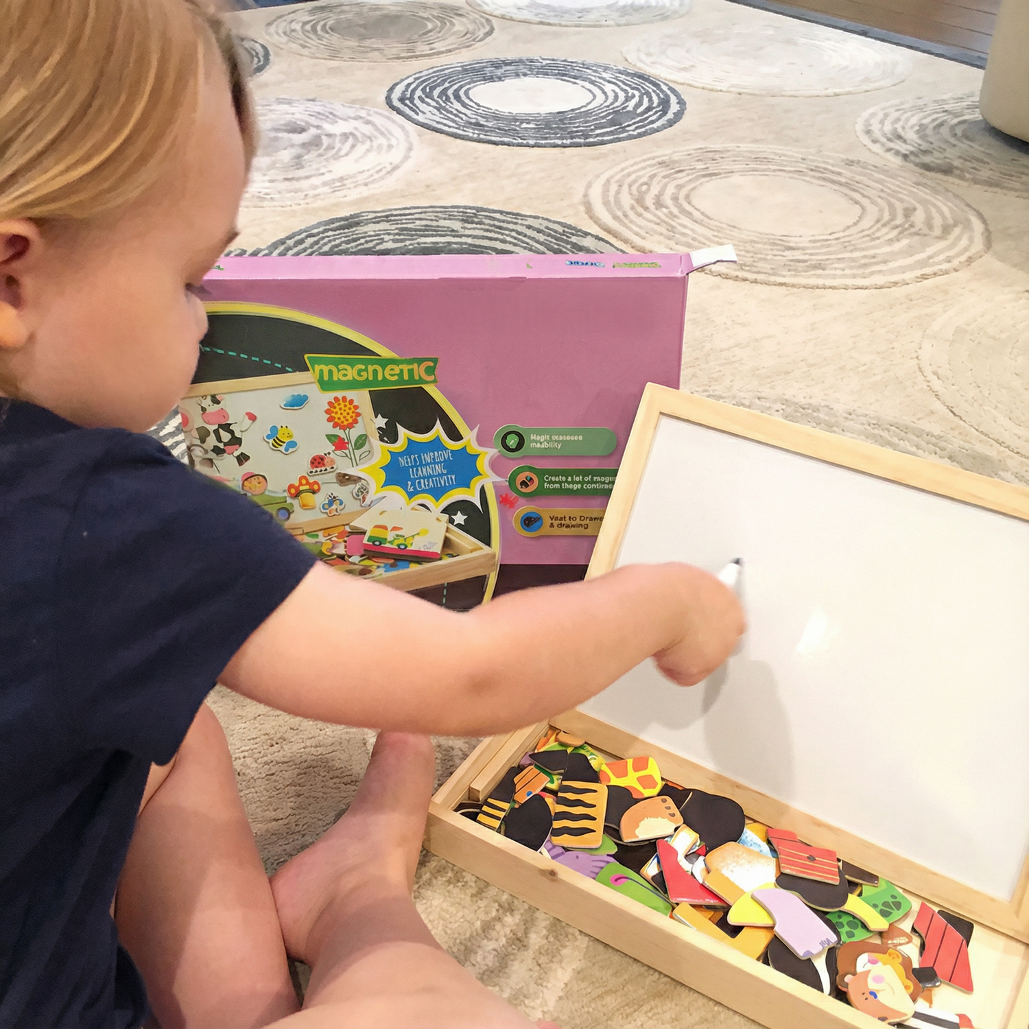 I en vardag full av mobiler och ljud är det en lättnad att se sitt barn fastna i något som är kreativt och rofyllt. Den magnetiska tavlan håller små händer sysselsatta, minskar stress och ger ett lugnare tempo hemma. Det här är leken som låter barnet utforska – och dig andas ut.